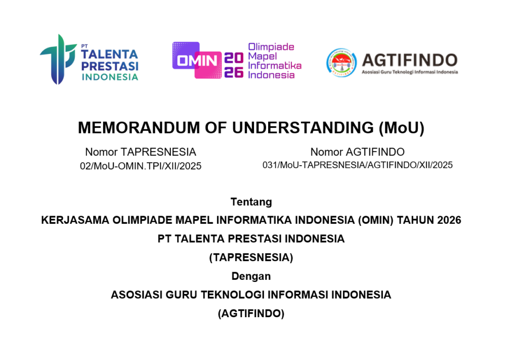 Jakarta, 15 Desember 2025 – PT Talenta Prestasi Indonesia (TAPRESNESIA) secara resmi menjalin kerja sama dengan Asosiasi Guru Teknologi Informasi Indonesia (AGTIFINDO) melalui penandatanganan Memorandum of Understanding (MoU) tentang Kerja Sama Penyelenggaraan Olimpiade Mapel Informatika Indonesia (OMIN) Tahun 2026. Penandatanganan MoU ini dilaksanakan pada Senin, 15 Desember 2025. Kerja sama ini ditandatangani oleh Fajar Indra […]